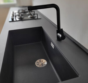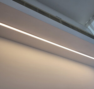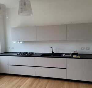 Elementi come tagli di luce, applique a parete e faretti incassati quadrati creano un'illuminazione elegante e funzionale. La scelta di materiali moderni, come le piastrelle contemporanee e il top cucina in gres, si integra perfettamente con gli arredi realizzati su misura, conferendo all'ambiente un carattere unico e armonioso.