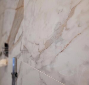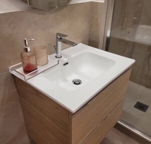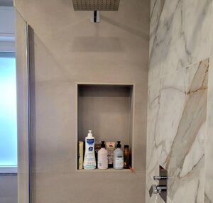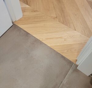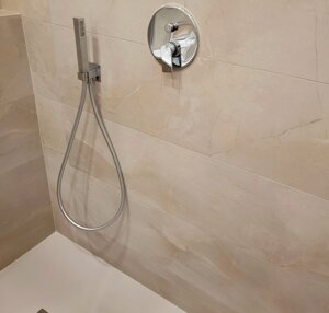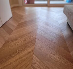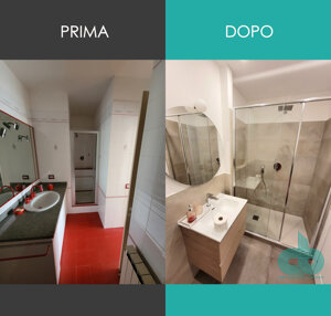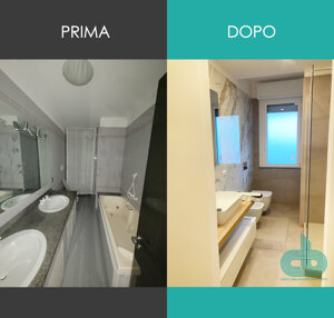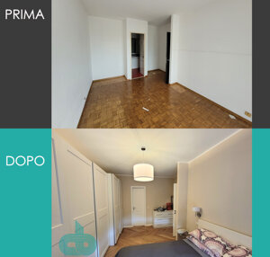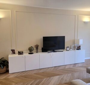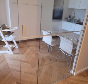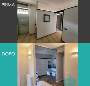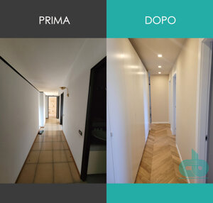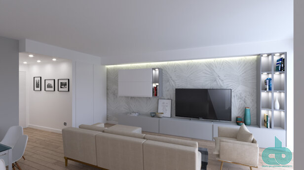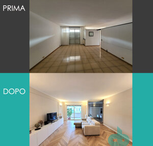 Ampio soggiorno dotato di divano chaise longue e parete attrezzata con boiserie, comunicante con la cucina mediante una parete vetrata dallo stile minimal e moderno. Pavimento in parquet per tutto l'appartamento carattetizzato dalla posa a spina ungherese e piastrelle in gres porcellanato nei servizi igienici. Doccia walk in con nicchia e rivestimento in gres effetto pietra ed effetto marmo.