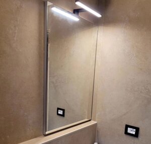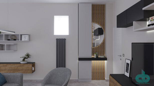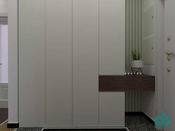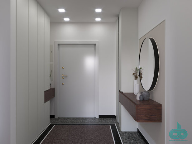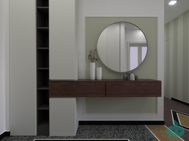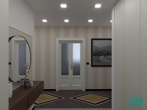 Un ampio specchio, incorniciato in una tonalità tortora, dialoga armoniosamente con la parete frontale, caratterizzata da eleganti strisce verticali tono su tono che conferiscono uniformità all’ambiente. La porta del servizio igienico è stata progettata a filo muro, dipinta nello stesso motivo della parete, per integrarsi senza interrompere la continuità visiva. Infine, un quadro di grande impatto, illuminato ad arte, sarà collocato sulla parete frontale, completando l’ingresso con un tocco di personalità.