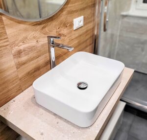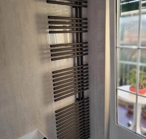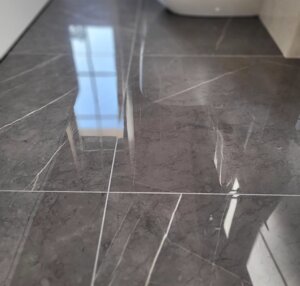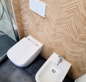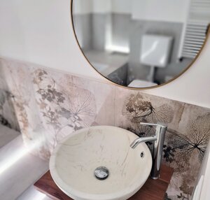 Bagno principale: è stato progettato per unire eleganza e praticità. Il piatto doccia in pietra (80x150 cm) si integra perfettamente con le piastrelle in gres grigio che rivestono il pavimento, creando un effetto di continuità cromatica. Le pareti sono impreziosite da piastrelle in gres effetto legno (30x90 cm), mentre la parete dei sanitari presenta lo stesso materiale in versione a rilievo, aggiungendo movimento e profondità all’ambiente. La zona doccia è caratterizzata da piastrelle di grande formato (60x120 cm) in tonalità bianco tenue, arricchite da delicati motivi floreali grigi, che donano un tocco raffinato e leggero. Il mobile con lavabo a vaschetta e gli altri arredi si inseriscono armoniosamente nel contesto, completando il design. Appena entrati, è stato ricavato un funzionale spazio lavanderia, nascosto da un’anta su misura, che ospita un piccolo lavatoio e una soluzione compatta con lavatrice e asciugatrice impilate, per ottimizzare gli spazi senza rinunciare allo stile.