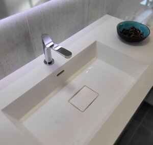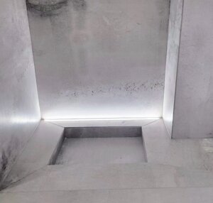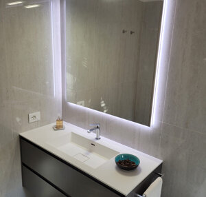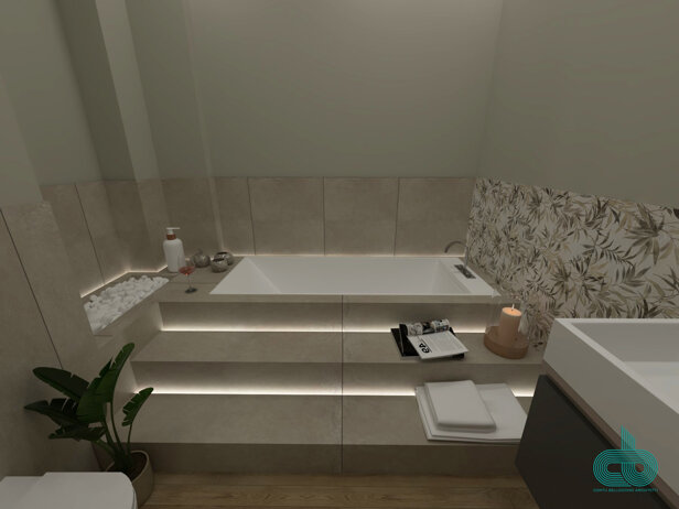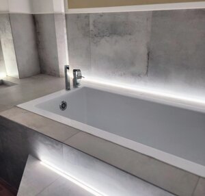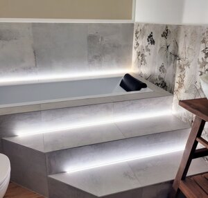 L'illuminazione, studiata nei minimi dettagli, combina faretti a LED e strisce luminose suddivise in diverse modalità, permettendo di alternare una luce diffusa e avvolgente a punti luce più intensi, ideali per creare un’atmosfera rilassante e personalizzata. Accanto alla vasca è stata ricavata una nicchia decorativa, arricchita da sassi bianchi, che aggiunge un tocco di eleganza naturale e contribuisce a valorizzare l’ambiente come spazio dedicato al benessere.