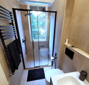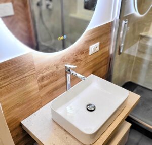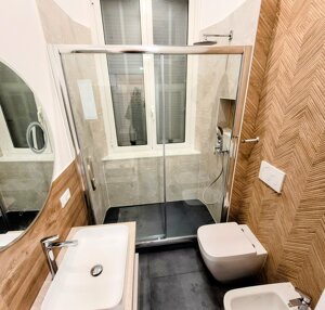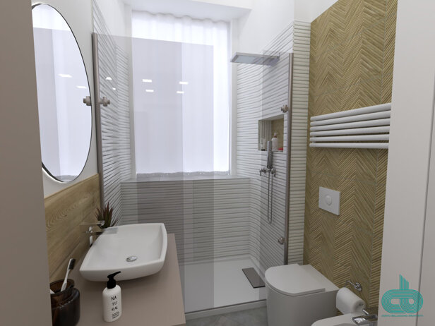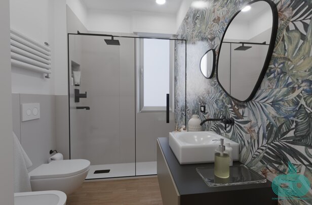 Bagno di servizio: nella camera da letto matrimoniale è stato annesso un bagno privato, originariamente accessibile dall’ingresso, trasformandolo in uno spazio esclusivo e dedicato al relax. Il design è stato concepito per offrire un’esperienza di relax e comfort, trasformando il bagno in un ambiente intimo e accogliente.