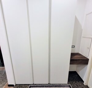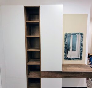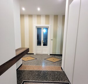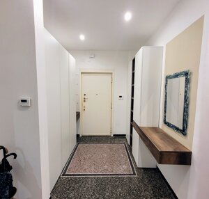 Ingresso: è stato ripensato in chiave moderna, con un design raffinato che combina luminosità e contrasti materici. I mobili, progettati e realizzati su misura in bianco, amplificano la luce naturale e sono impreziositi da un elemento decorativo in legno scuro che interrompe l’armadiatura in modo equilibrato, richiamando dettagli presenti sia a sinistra che a destra dello spazio.