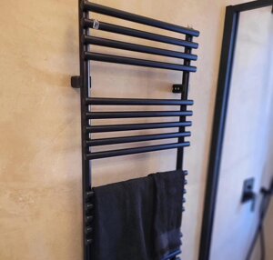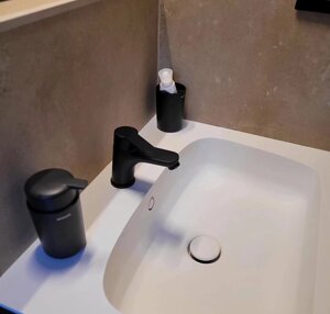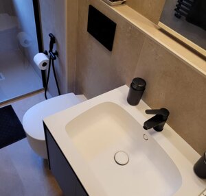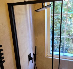 Bagno di servizio: un ambiente funzionale e di carattere, progettato con attenzione al design e alla praticità. La spaziosa doccia da 80×120 cm è incorniciata da rivestimenti in gres ceramico effetto travertino opaco (60x120 cm per le pareti, 60x60 cm per il pavimento), creando un'atmosfera naturale e sofisticata. Il piatto doccia in resina, coordinato al pavimento, garantisce una continuità visiva impeccabile. La monocromia delle superfici si arricchisce con dettagli di forte impatto, come arredi, rubinetterie e accessori in nero opaco. Il vaso wc a filo muro, in ceramica bianca opaca, è accompagnato da un idroscopino in metallo nero, mentre il mobile sospeso, con lavabo integrato, completa l'insieme con uno stile minimal e funzionale. Un termoarredo di design nero opaco aggiunge il tocco finale, dialogando armoniosamente con il resto dell'ambiente.