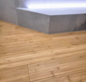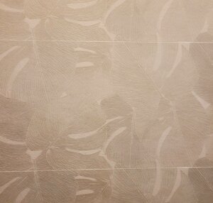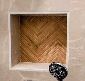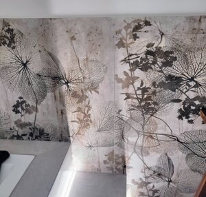 La pavimentazione in legno di bambù aggiunge calore e naturalezza, in armonia con le superfici in gres di grande formato (60x120 cm) che rivestono le pareti, arricchite da un raffinato motivo floreale per un effetto rilassante e sofisticato.