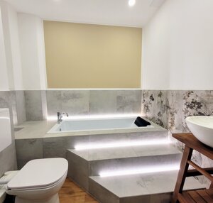 L’elemento centrale è una vasca idromassaggio, accessibile tramite tre scalini rivestiti in gres grigio chiaro e illuminati con strisce LED, per creare un’atmosfera intima e accogliente. Il bagno è completo di sanitari, installati grazie a un sistema sanitrit, e di un piccolo lavandino con mobile coordinato, perfettamente integrato nel contesto.